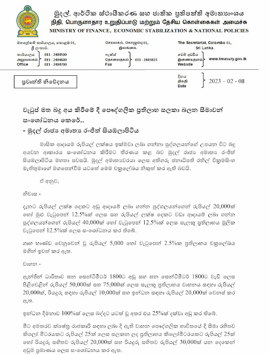 වැටුප් මත බදු අය කිරීමෙදී පෞද්ගලික ප්රතිලාභ සලකාබලන සීමාවන් සංශෝධනය කිරීමට තීරණය කළ බව මුදල් රාජ්ය අමාත්ය රංජිත් සියඹලාපිටිය මහතා නිවේදනයක් නිකුත්කරමින් පවසයි.